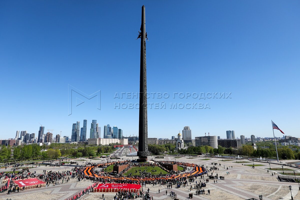 Акция с 300-метровой Георгиевской лентой и масштабной копией Знамени Победы на Поклонной горе