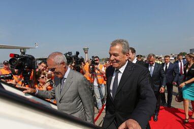 Вице-президент Airbus по Восточной Европе и Центральной Азии Андреас Крамер (справа) во время презентации самолета Airbus A350 XWB в Шереметьево.