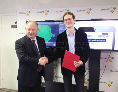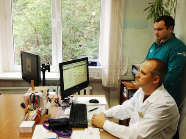 И.о руководителя департамента здравоохранения Москвы Георгий Голухов (слева) на демонстрационном показе электронных сервисов амбулаторно-поликлинического обслуживания.