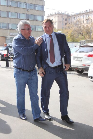 Главный редактор АО «Москва Медиа» Игорь Шестаков (слева) и заместитель мэра Москвы Марат Хуснуллин перед пресс-конференцией по случаю открытия пресс-центра Агентства городских новостей «Москва».