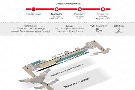 «Тропарево» - односводчатая станция мелкого заложения, ее длина с учетом пристанционных сооружений - 349 м. Архитектурный образ перронного зала станции запроектирован как аллея парка под раскидистыми кронами деревьев, поскольку москвичи ассоциируют Тропарево с одноименной лесопарковой зоной отдыха. Для удобства маломобильных групп населения станция оснащена системой лифтов. «Тропарево» будет временно конечной станицей на юго-западном участке Сокольнической линии метрополитена до ввода в эксплуатацию станций «Румянцево» и «Саларьево».