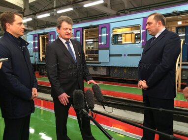 Заммэра Москвы, руководитель департамента транспорта и развития дорожной-инфраструктуры М.Ликсутов (слева), заместитель главного конструктора завода «Метровагонмаш» А.Зайцев (в центре), начальник Московского метрополитена Д.Пегов (справа)