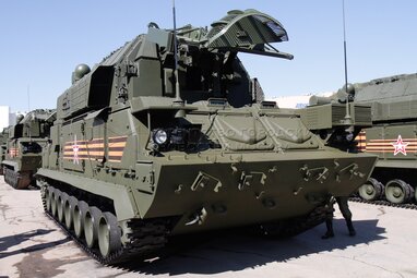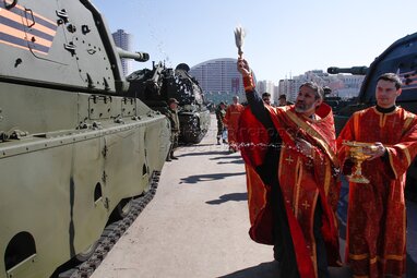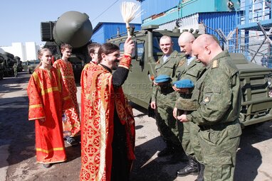 Обряд благословения участников Парада Победы и освящения пусковых установок подвижного грунтового ракетного комплекса «Ярс» настоятелем патриаршего подворья при штабе Ракетных войск стратегического назначения на Ходынском поле.