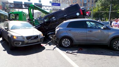 На Варшавском шоссе около д. 7 произошло ДТП с участием пяти автомобилей. В результате столкновения внедорожник Hummer заехал на крыши легковых машин.