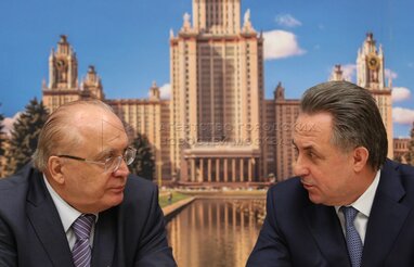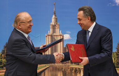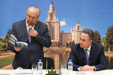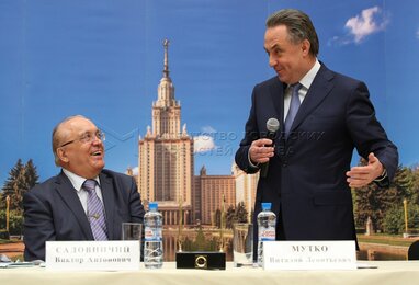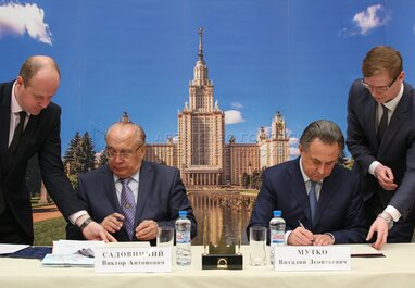 Ректор МГУ Виктор Садовничий (слева), министр спорта РФ Виталий Мутко (справа) на подписании соглашения о сотрудничестве