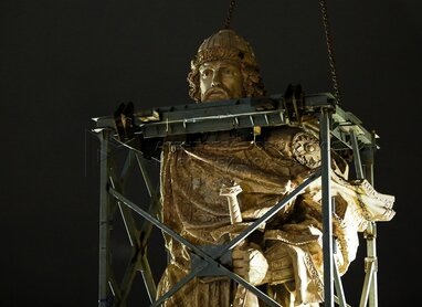 Автор памятника князю Владимиру, скульптор Салават Щербаков на установке памятника князю Владимиру на Боровицкой площади