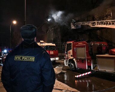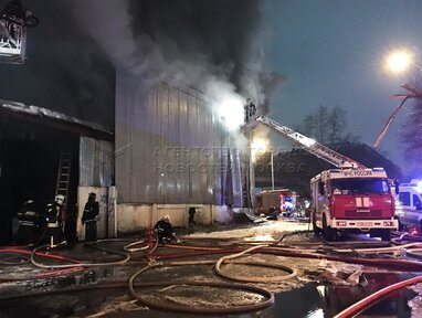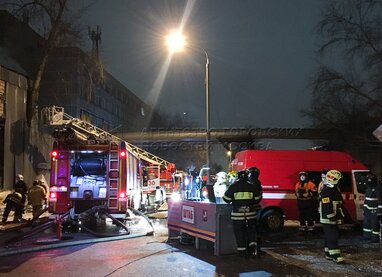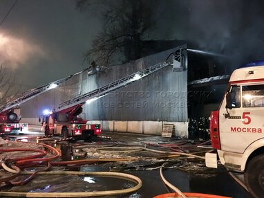 Работа пожарных служб по тушению пожара в ангаре на юго-востоке Москвы
