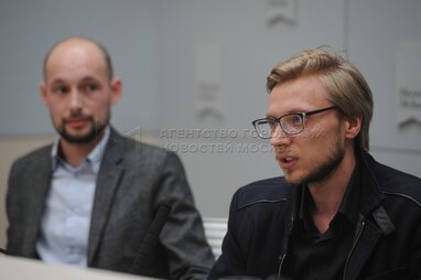 Организатор проекта «Гуляем по Москве» Евгений Степанов (слева), научный сотрудник ГБУК г. Москвы «Мемориальный музей А.Скрябина», победитель городского конкурса профессионального мастерства «Московские мастера» в номинации «Лучший экскурсовод - 2016» Денис Хоров (справа) на пресс-конференции, посвященной Дню экскурсовода.