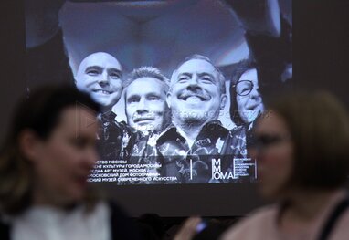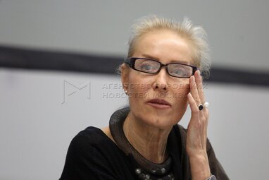 Директор МАММ Ольга Свиблова (на первом плане), актер Михаил Ефремов (справа), певец Гарик Сукачев (на заднем плане) во время Public Talk в Московском Мультимедиа Арт Музее (МАММ).