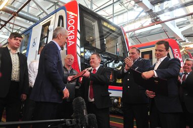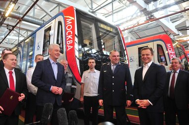 Мэр Москвы Сергей Собянин (в центре) на запуске первых поездов «Москва» на Таганско-Краснопресненской линии метро.