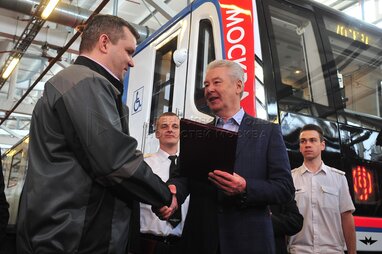 Мэр Москвы Сергей Собянин (справа) на запуске первых поездов «Москва» на Таганско-Краснопресненской линии метро.
