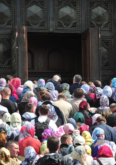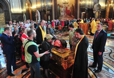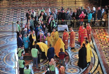 Поклонение верующих мощам святителя Николая Чудотворца в храме Христа Спасителя