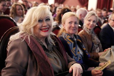Президент благотворительного фонда «Русский силуэт» Татьяна Михалкова (справа) на премьере спектакля Академии кинематографического и театрального искусства Никиты Михалкова «Метаморфозы-2» в Московском государственном театре эстрады