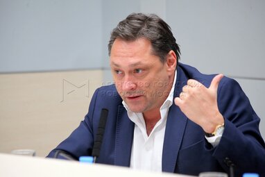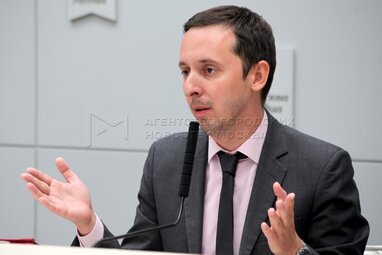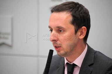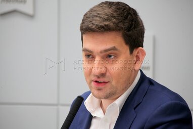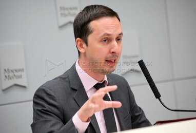 Главный продюсер объединенной редакции московских ЭСМИ «Москва Медиа» Алексей Вершинин во время пресс-конференции, посвященной народному интерактивному телепроекту «Пульс города»