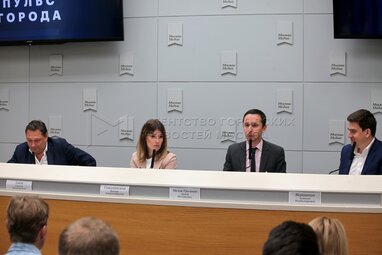 Главный врач городской клинической больницы № 1 им. Пирогова Алексей Свет, тедущая телеканала «Москва 24» Ксения Соколянская, директор НИИ Организации здравоохранения и медицинского менеджмента департамента здравоохранения Москвы Давид Мелик-Гусейнов, главный продюсер объединенной редакции московских ЭСМИ «Москва Медиа» Алексей Вершинин (слева направо) во время пресс-конференции, посвященной народному интерактивному телепроекту «Пульс города»