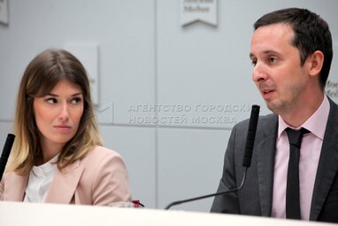 Ведущая телеканала «Москва 24» Ксения Соколянская во время пресс-конференции, посвященной народному интерактивному телепроекту «Пульс города»
