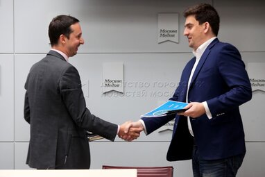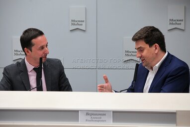 Директор НИИ Организации здравоохранения и медицинского менеджмента департамента здравоохранения Москвы Давид Мелик-Гусейнов (слева), главный продюсер объединенной редакции московских ЭСМИ «Москва Медиа» Алексей Вершинин во время пресс-конференции, посвященной народному интерактивному телепроекту «Пульс города»