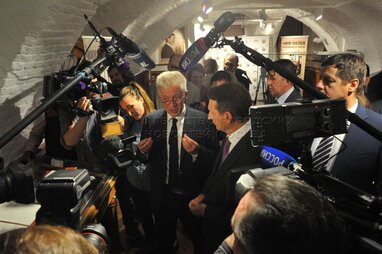 Генеральный директор Первого канала Константин Эрнст (в центре) во время открытия выставки, посвященной советскому разведчику Киму Филби, в доме Российского исторического общества