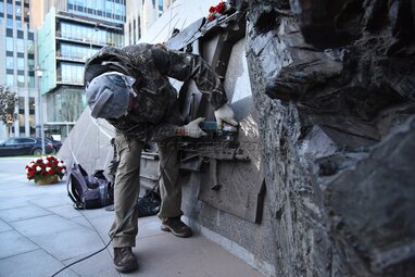 Демонтаж чертежа немецким автомата StG 44 с барельефа памятника оружейному конструктору Михаилу Калашникову. Автор фото: Симонов Никита /портал Москва 24.