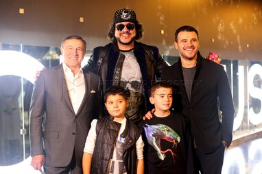 Президент и владелец группы компаний Crocus Group Араз Агаларов, народный артист РФ, певец Филипп Киркоров, первый вице-президент группы компаний Crocus Group, певец Эмин Агаларов с сыновьями (слева направо) во время открытия фитнес-клуба нового поколения Crocus Fitness в ТРК «Вегас Крокус Сити»