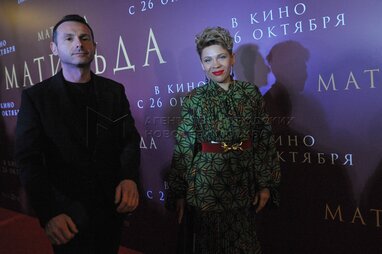 Шоумен Вадим Галыгин с женой Ольгой на премьере фильма режиссера Алексея Учителя «Матильда» в кинотеатре «Каро 11 Октябрь»