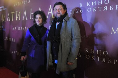 Пародист Михаил Грушевский с женой Евгенией на премьере фильма режиссера Алексея Учителя «Матильда» в кинотеатре «Каро 11 Октябрь»