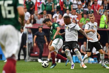 Игроки сборной Мексики, Эктор Эррера (слева), Карлос Вела (в центре), игрок сборной Германии Йозуа Киммих (справа) во время матча чемпионата мира по футболу 2018 г. между сборными Германии и Мексики на стадионе «Лужники». Автор фото: Сергей Киселев.