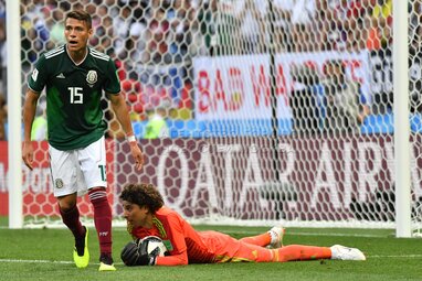Игрок сборной Мексики Эктор Морено, вратарь сборной Мексики Гильермо Очоа (слева направо) во время матча чемпионата мира по футболу 2018 г. между сборными Германии и Мексики на стадионе «Лужники». Автор фото: Сергей Киселев.