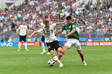 Игрок сборной Германии Йозуа Киммих, игрок сборной Мексики Карлос Вела (слева направо) во время матча чемпионата мира по футболу 2018 г. между сборными Германии и Мексики на стадионе «Лужники». Автор фото: Игорь Иванко.