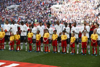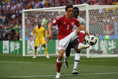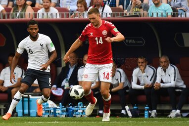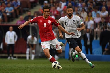 Матч между сборными Дании и Франции на стадионе «Лужники» в рамках чемпионата мира по футболу 2018 г.