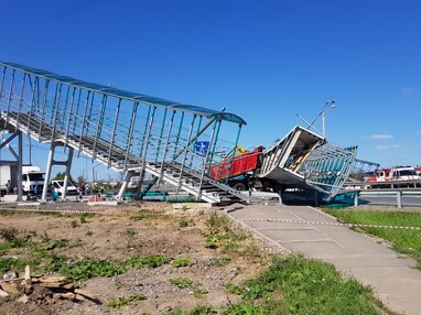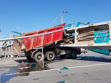 Последствия аварии с участием самосвала, врезавшегося в опору надземного пешеходного перехода на 33 км Ярославского шоссе в районе городского округа Пушкино.