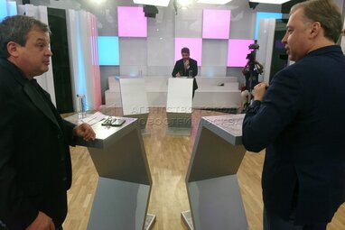 Кандидат в мэры Москвы от КПРФ Вадим Кумин (слева), кандидат в мэры Москвы от партии «Союз горожан» Михаил Балакин (справа) на предвыборных теледебатах кандидатов на пост мэра столицы на канале «Москва 24».