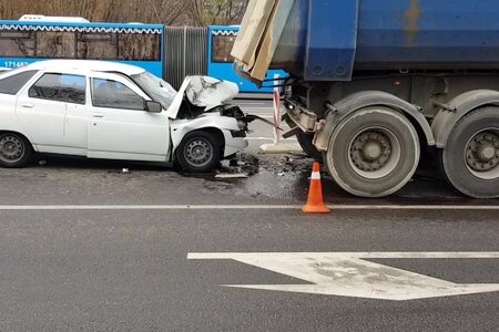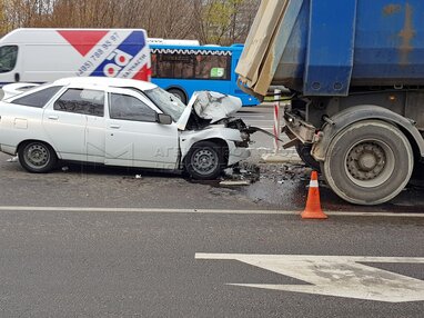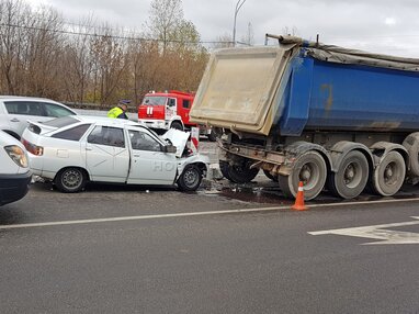 Последствия ДТП c участием легкового автомобиля и грузовика в районе д. 32 на ул. Подольских Курсантов.