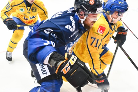Нападающий Доминик Кубалик (Чехия) и защитник Том Нильссон (Швеция) (слева направо) во время матча между хоккейными сборными Чехии и Швеции в Ледовом дворце Парка легенд.