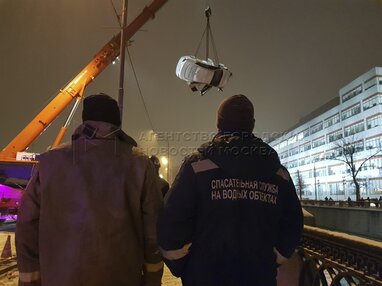Сотрудники МЧС на месте упавшего автомобиля в Москву-реку на Русаковской набережной.