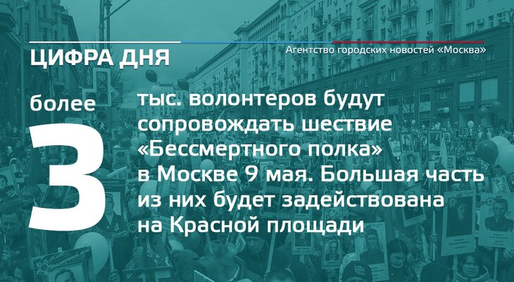 Цифра дня 24 апреля: Более 3 тыс. волонтеров будут сопровождать шествие «Бессмертного полка» в Москве.