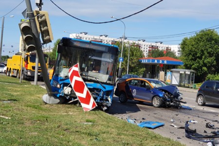 Последствия ДТП с участием автобуса и автомобиля каршеринга на юге Москвы.