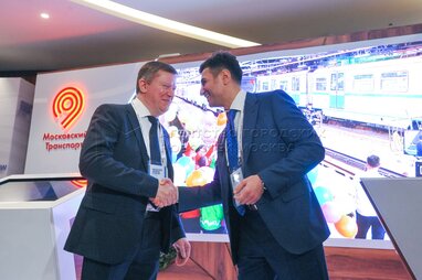Заместитель начальника метрополитена – начальника дирекции инфраструктуры Дмитрий Дощатов и первый заместитель руководителя департамента транспорта и развития дорожно-транспортной инфраструктуры Москвы Гамид Булатов на Moscow Urban Forum 2019 в парке «Зарядье».