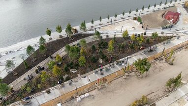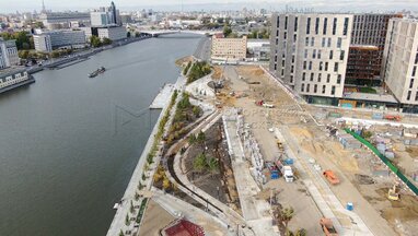 Вид с квадрокоптера на работы по благоустройству участка набережной Марка Шагала.
