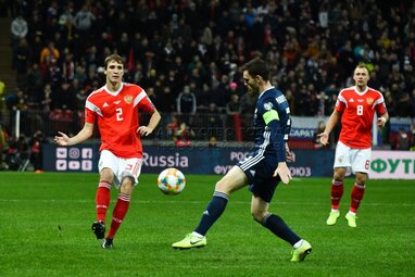 Игроки слева направо - Джон Флек (Шотландия), Каллум Макгрегор (Шотландия), Юрий Жирков (Россия), Лоуренс Шанклэнд (Шотландия), Фёдор Кудряшов (Россия) в футбольном матче отборочного турнира ЕВРО-2020 между сборными России и Шотландии на стадионе «Лужники».