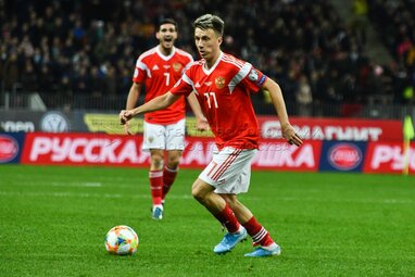 Игрок сборной России Александр Головин в футбольном матче отборочного турнира ЕВРО-2020 между сборными России и Шотландии на стадионе «Лужники».