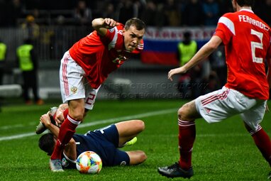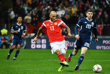 Игрок сборной России Марио Фернандес (в центре) в футбольном матче отборочного турнира ЕВРО-2020 между сборными России и Шотландии на стадионе «Лужники».
