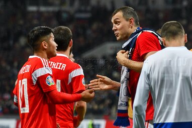 Игроки сборной России Игрок сборной России Ильзат Ахметов и Артем Дзюба (слева направо на переднем плане) радуются после забитого гола в ворота сборной Шотландии в футбольном матче отборочного турнира ЕВРО-2020 между сборными России и Шотландии на стадионе «Лужники».