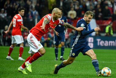 Игрок сборной России Артем Дзюба (слева) и игрок сборной Шотландии Роберт Снодграсс в футбольном матче отборочного турнира ЕВРО-2020 между сборными России и Шотландии на стадионе «Лужники».