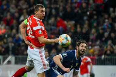 Игроки сборной Шотландии Роберт Снодграсс и сборной России Артем Дзюба (снизу вверх) в футбольном матче отборочного турнира ЕВРО-2020 между сборными России и Шотландии на стадионе «Лужники».
