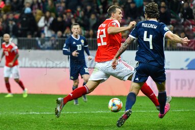 Игрок сборной России Денис Черышев (слева) и игрок сборной Шотландии Райан Кристи в футбольном матче отборочного турнира ЕВРО-2020 между сборными России и Шотландии на стадионе «Лужники».