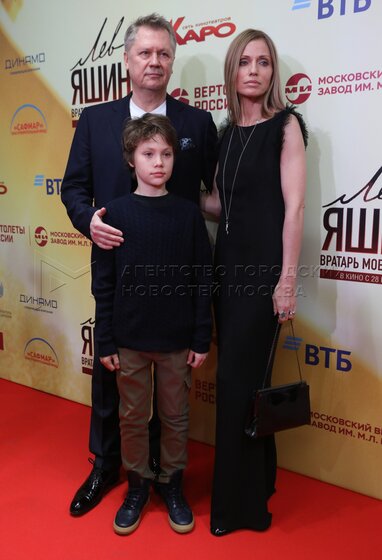 Актер Андрей Бурковский, его супруга Ольга и сын Максим на премьере фильма «Лев Яшин. Вратарь моей мечты» в кинотеатре «Каро 11 Октябрь».