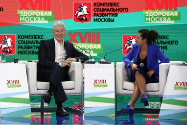Мэр Москвы Сергей Собянин и главный редактор телеканала RT Маргарита Симоньян во время пленарного заседания «Здоровье больших городов: большие вызовы и большие возможности» в рамках ассамблеи «Здоровая Москва» на ВДНХ.