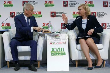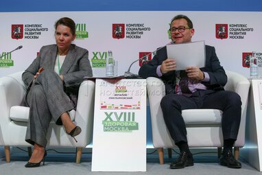Вице-мэр Москвы Анастасия Ракова и генеральный директор ФГБУ «Центр экспертизы и контроля качества медицинской помощи» Министерства здравоохранения РФ Виталий Омельяновский во время круглого стола «Организация онкологической помощи в больших городах» в рамках ассамблеи «Здоровая Москва» на ВДНХ.