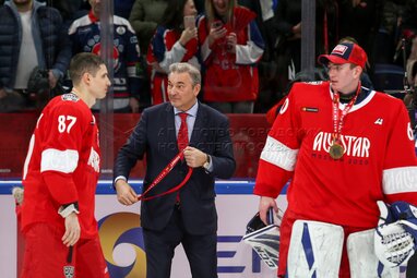 Игроки дивизиона Боброва Вадим Шипачев, дивизиона Тарасова Кирилл Капризов, президент КХЛ Дмитрий Чернышенко, президент Федерации хоккея России Владислав Третьяк, игрок дивизиона Харламова Данис Зарипов и дивизиона Чернышева Микко Лехтонен (слева направо) перед началом матча звезд КХЛ-2020 на «ВТБ Арене».